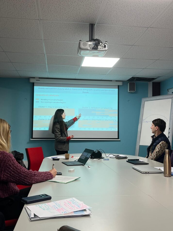 Présentation des travaux de thèse de Sarah Joubaire sur les mobilités résidentielles des jeunes en Lorraine et les inégalités d’accès à l'emploi et aux services de transports. Février 2026, Strasbourg.